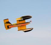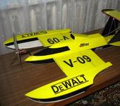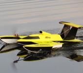 побаловаться экзотикой. Как-то попалось на глаза видео, где странной формы модель шустро бегала по воде и потом эффектно взлетала, выделывая кульбиты. То, что нужно! Сказано - сделано;). Подробную информацию нашел здесь www.rcgroups.com/forums/showthread.php?t=560468 (подобные аппараты также где-то обсуждались на этом форуме), чертежи там же. Исходя из имеющейся электроники (двигатель под винт диаметром 9 дюймов) увеличил размеры в 1,3 раза, да и эффектней выглядит в таком масштабе. Сегодня успешно обкатал и облетал. Что сказать, здорово, забавно, игрушка что надо!😃 По воде как по рельсам (правда был полный штиль), разворачивается вокруг себя при необходимости. Взлет уверенный, чувствуется задняя центровка. Пока кульбитов не выделывал, не хватает тяги. После полетов оказалось, что вздулась банка аккумулятора (который кстати пережил уже не одну модель), поэтому недостаток тяги спишем на это дело. В общем, рекомендую для забавы и отдыха:)