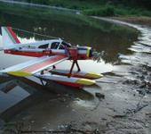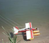 В 5 утра с женой, дочкой и мл. сыном выехали на водоём. Озеро приличных размеров, правда по периметру стоят ели и сосны, ветра нет – полный штиль, из помех только небольшой пар с воды. Мандражец конечно есть, так как самолёт без поплавков не облётывался,да и не плавался 😃. Приступаем к ходовым испытаниям: плывёт хорошо, ровно, прибавляю газ, пробую руль направления, реакции адекватные, если газом не перебарщивать поворачивает без крена. Вывожу на прямую, начинаю разгон, но самолёт не глиссирует ( не выходит на редан! )😦. Вот тут уже реально мандраж бьёт! Аккуратно разворачиваю ( уплыл-то он на середину озера ) , ощущения, я вам скажу, совсем другие, когда ты на берегу, а он там на середине в воде, может судомоделистам это привычно, но мне не по себе стало! Подруливаю аккуратно на исходную и по новой разгон, но более энергично открываю газ и слышу пошёл сильный треск – вода пошла на лопасти винта. Прекращаю разгон так и не добившись глиссера!