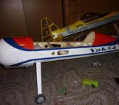 Размах крыльев 102см., полётный вес около 850гр. ВМГ была построена на моторе Turnigy 3530SK-1100kv с винтом 11х7 и регулем на 35А, в вертикаль уходил не особо напрягаясь. Полётное время +/-7мин. с липолькой 3$ 1750mAh. Под липольку немного подрезал батарейный отсек снизу. Центровка ровно по пенопластовому “лонжерону” внутри крыльев(видно на просвет в крыле). В сам лонжерон для усиления была вклеена карбоновая рейка сечением примерно 3х2мм. Передние кромки крыльев усилял армированным скотчем так же, как и нижнюю часть фюзеляжа. Площадку шасси усиливал сразу, стойки дюралевые с растяжкой. Отлетал на этом Яке весь прошлый сезон, очень хороший тренер перед переходом на бальзовые пилотажки.