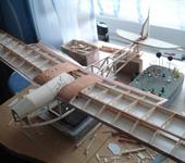 Не смертельно-но… На будущее учту. Ну и второй косяк- кое где подклеивал полки с нижней стороны-и потом в спешке забыл их лаком покрыть, Если бы самолёт был бы под покраску-то кайн проблем-а тут хочу оставить в первозданном виде. Дуну только прозрачным лаком. Нижняя часть фюзеляжа обтянута шёлком, Хвостовая балка-бумагой.
