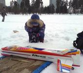 посадка тоже прошла штатно, только чучуть прижал его - думал пролетит мимо места взлета. снег мягкий, много - хорошо. без шасси летал.