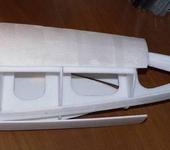 Крыло. Фотки первоначального варианта где-то выше на этой ветке. Планировалось два разъема в районе элеронов (чтобы модель могла влезть в багажник). Но сделать по-человечески не получилось, зато вес увеличился на 120г.