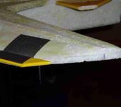 Толщина профиля получается переменной. Как я уже говорил, крыло было склеено из двух листов 8мм ЕРР. Таким образом толщина крыла (не относителтная толщина) вдоль всей длины крыла одинакова. На законцовках длина хорды 120мм. Значит относительная толщина профиля 16/120=13%. К корню соответственно относительная толщиня профиля уменьщается и становится приблизительно 5%. К чему это приводит? К тому, что на больших углах атаки в то время как у корня уже наступил срыв потока, законцовки продолжают работать, там еще срыва нет. Это и обеспечивает не срывность и хорошую устойчивость. Сам профиль видно на одной оз картинок. Я специально сделал такое фото.