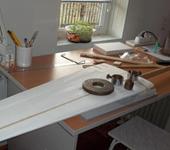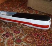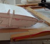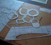 В начале, фотки как крыло делал. Фюзеляж если найду, то чуть позже . Все обтягивал белым скотчем , натяжка паяльником с насадкой. Сначала распустил лист пенопласта 100 мм на толщину корневого профиля . Разметил консоль симметрично с двух сторон и с помощью полос из ватмана электролобзиком отрезал . на фотке видно. Потом консоль делил на три части . Шаблоны нервюр из ватмана , приходится вычерчивать промежуточные нервюры. Готовые части склеиваем и вставляем лонжерон. Лонжерон из Абаша, потому цельный , без облегчения. На второй короткий лонжерон ,монтируется основное шасси. Элероны сделал по всей длине, для лучших бочек. В центроплане есть пазы , впереди один и два сзади, из того же Абаша выпиливаю носок нервюры и два хвостика , в них будут сверления для крепления крыла саморезами ,на фото есть. Когда всё крыло склеено , наждачкой убрать все неровности , и нулёвкой слегка отшлифовать на сколько это возможно, на этой стадии главное быть рядом с пылесосом )