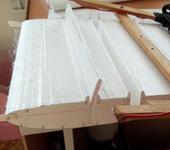 В начале, фотки как крыло делал. Фюзеляж если найду, то чуть позже . Все обтягивал белым скотчем , натяжка паяльником с насадкой. Сначала распустил лист пенопласта 100 мм на толщину корневого профиля . Разметил консоль симметрично с двух сторон и с помощью полос из ватмана электролобзиком отрезал . на фотке видно. Потом консоль делил на три части . Шаблоны нервюр из ватмана , приходится вычерчивать промежуточные нервюры. Готовые части склеиваем и вставляем лонжерон. Лонжерон из Абаша, потому цельный , без облегчения. На второй короткий лонжерон ,монтируется основное шасси. Элероны сделал по всей длине, для лучших бочек. В центроплане есть пазы , впереди один и два сзади, из того же Абаша выпиливаю носок нервюры и два хвостика , в них будут сверления для крепления крыла саморезами ,на фото есть. Когда всё крыло склеено , наждачкой убрать все неровности , и нулёвкой слегка отшлифовать на сколько это возможно, на этой стадии главное быть рядом с пылесосом )