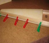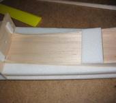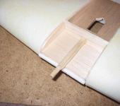 Крыло состоит из ящикообразного центроплана, бальзового лонжерона, корневых и концевых нервюр. Сборка понятна из картинок. Из газеты делаем развертку для обшивки. Гтовую депроновую деталь гнем с помошью фена и клеим на крыло. Центроплан обклеиваем отдельно. Не забываем установить штивт крепления крыла. Внизу из двух реечек формируем посадочную площадку для машинки.