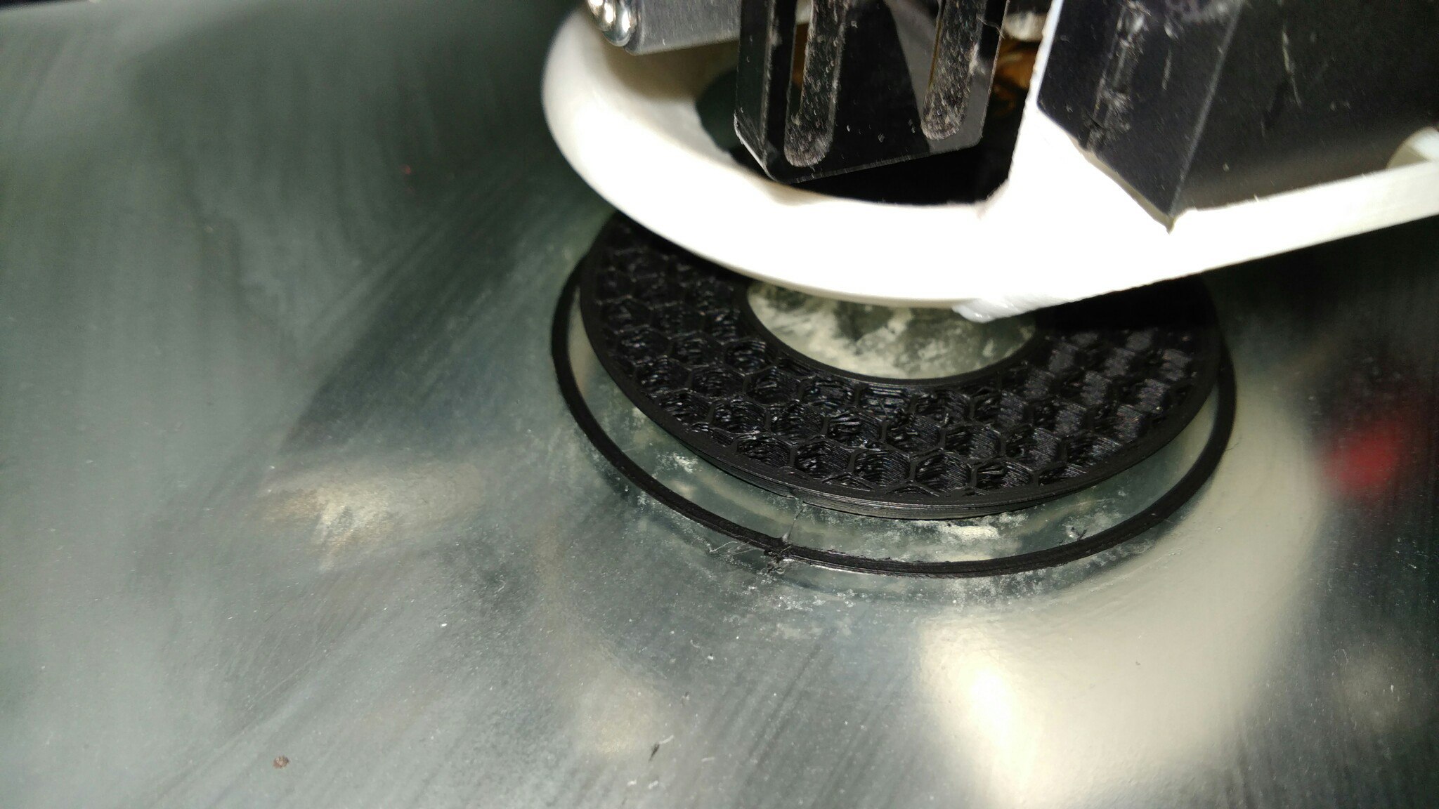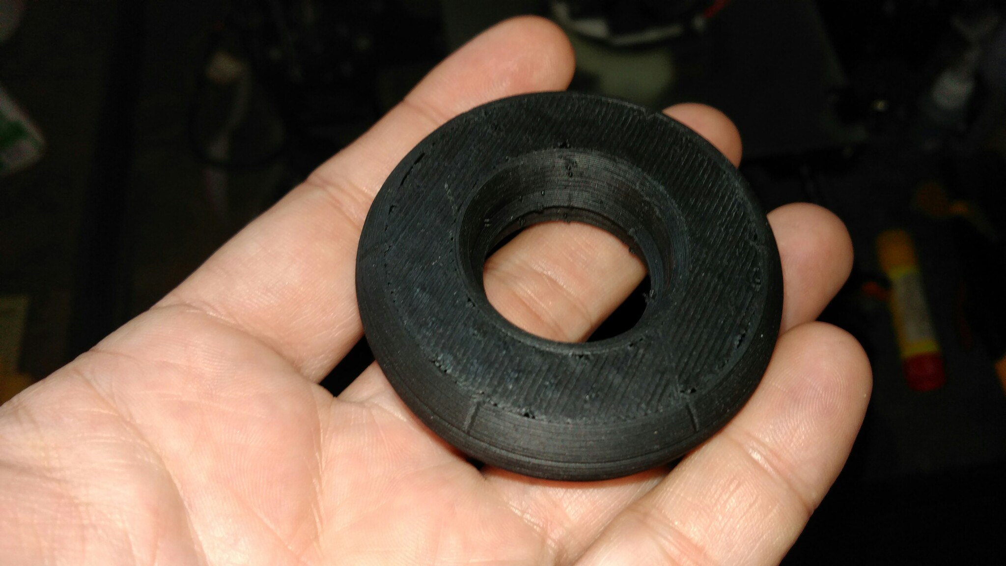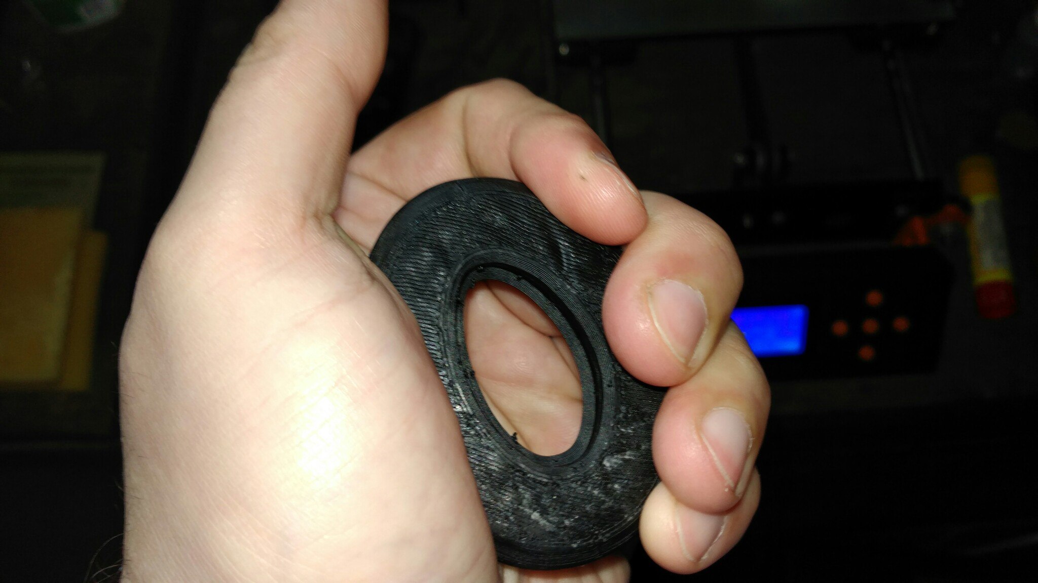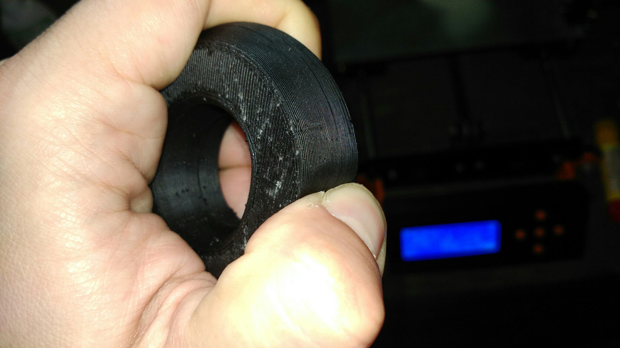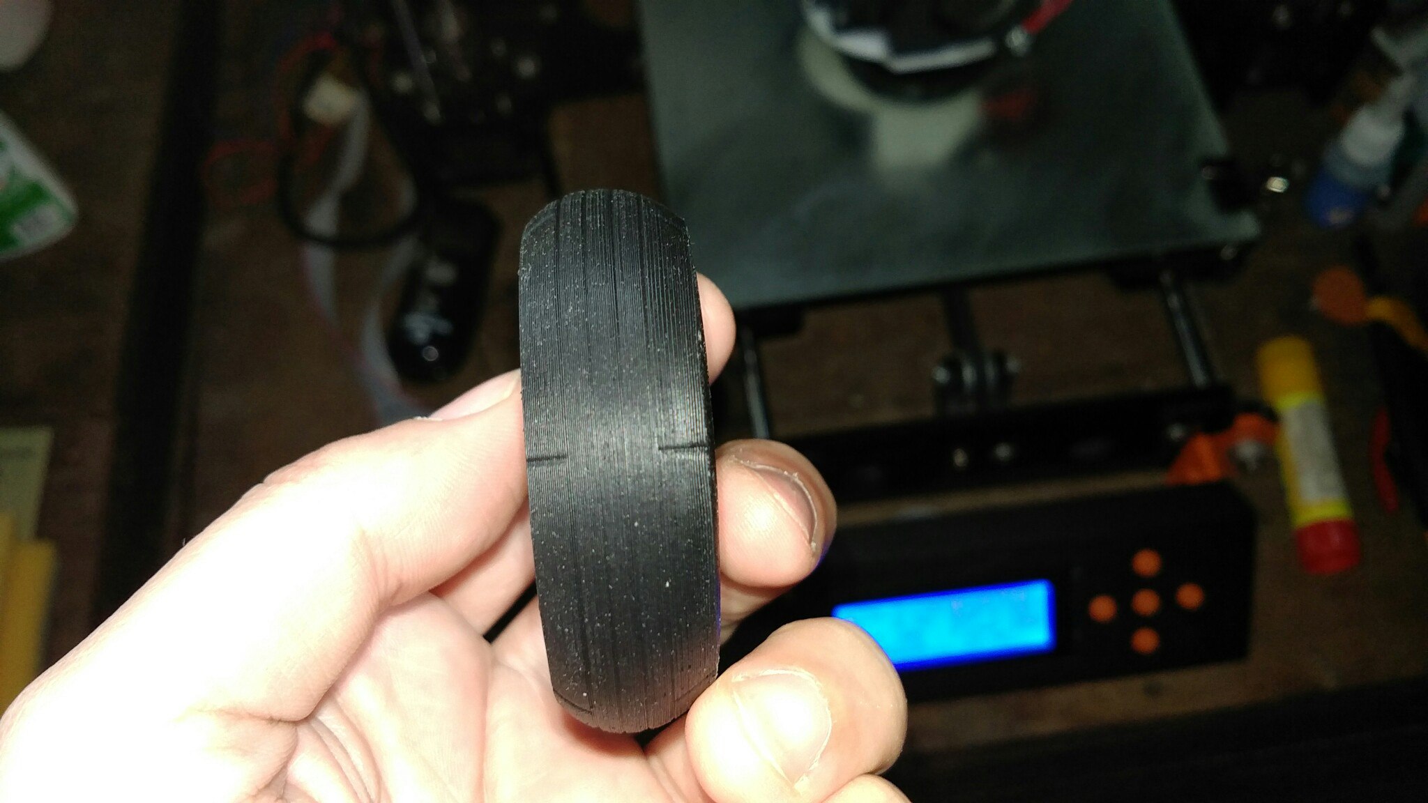 Поставил на ночь печатать шину тренера. И что я вам скажу? Не так страшен Rubber как его малюют! Самое трудное, в моем случае, это адгезия к столу. От ПВА-М отваливается, от Каляки-Маляки отваливается, от лака отваливается. Намазал всего сразу - более менее держится. Утром получил колесо!