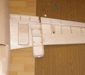 Да, лонжерон бальзовый, это я сделал намерено. Дело в том, что аллюминиевая трубка диаметром 20мм проходит насквозь фюзеляжа до места стыка сьемных законцовок. В законцовках стоият тоже кусочки диаметром 18мм, для пристыковки крыльев. В общем бальзовый лонжерон нужен лиш как основа для формирования профиля крыла. Всю силовую нагрузку берет на себя трубка. Нервюры же сделаны из 6мм бальзы с облегчающими отверстиями. В общем конструкция получилась очень жесткая. Здесь у меня нет сомнений. Вот здесь видно лучше.