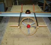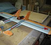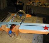 Для уравновешивания кольцевой винтомоторной группы (а цт. модели расположен в 20мм перед крылом!), Кокамовский аккомулятор (три банки 2000м/ач) вынесен на фанерно-бальзовой бутербродной пластинке, вместе с “килевой” рул. машинкой, на самый “зад” конструкции, и соеденён с двигателем мягкими посеребрянными проводами.