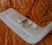 На фотографии моей лыжи видно как она утопла в свежий снег (прошлое воскресенье). Вес самолета 2,5-2,6кг. Размер лыж - 6х26см плюс 4см загнутый носок (больше не надо) Угол первого излома ~30*, второй добавляет до 45*