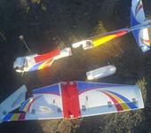 В общем нет больше у нас этого самолета 😦. В результате ошибки пилота самолет упал с 20 метров. в обще м, классическая морковка, то что осталось на снимке. Та что было остановлено не подвело и не рассыпалось. По поводу пласмасового болта могу сказать, там не болт срежет там скорее само крыло порвет если не усиливать место крепления. Востанавливать повторно смысла не вижу, так как необходимо изготавливать заново крыла (такую мозайку без потери прочности не склеить) и сильно деформироваласть и промялась передняя часть фьюзеляжа + деформация в районе крыла. Возможно хвост, фонарь и элероны пойдут на другую модель, но это потом. Если судить по крашу, усиливать фьюз смысла особого нет, штатной площадки под аки вполне хватило. Переднее крепление крыла, можно и переделать, но на нашей модели с ним ничего страшного не случилось, хотя летали жестко. Заднее однозначно усилить чем нибуть, в штатном исполнении это 3 слоя потолочки, выводы делайте сами. После после первого ремонта это место было усилино линейкой и в результате аварии вырвало гайку из фьюза.