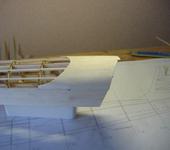 Прямо на каркасе из бумаги готовим выкройки обшивки. ПО этим выкройкам вырезаем элементы зашивки гаргота, боковин и нижней части фюзеляжа. На пару гнём, фиксируем на фюзеляже до высыхания и приклеиваем. Точная подгонка осуществляется по месту.