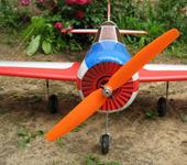 Во время полета едва успевал реагировать. Только через пару минут полета немного приноровился и заставил лететь более ровно. Выяснилось, что устойчиво держаться в воздухе он может только на приличной скорости. Это было для меня неожиданно, т.к. мой первый высокоплан Як-12 (приблизительно такого же размера и полетного веса 430г) вел себе очень устойчиво даже на минимальных скоростях. Кроме того при маневрировании Як-52 часто норовил свалиться. Реакция на рули какая-то неоднозначная: то очень резко отзывается и, выкручивая суровый крендель, пытается сорваться, то немного замедленная и вялая. В общем в сочетании с непривычно большой для меня скоростью полета напряжение было сильное.