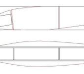 Вот, пришла в голову идея - сделать коробку (показано черным) из вертикальных контуров с деревянной моторамой и парой дополнительных шпангоутов для прочности, а ширину коробки установить по ширине двигателя (ужать мидель). Оставшиеся обводы (красные) вышкурить из пены. По моим подсчетам липовая батарея 3S, аппа и серва влезают