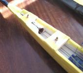 в качестве хвостовой балки было взято одно из верхних колен старой стеклопластиковой удочки, для обтяжки использовал тонкий цветной скотч, потолочку с потолочкой/деревом/хвостовой балкой клеил титаном, дерево с деревом циакрином;