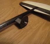 Поскольку целью было применение недифицитных материалов, то применялся на крыло ЭЛУР 0,08 мм и стекло 48 г. Провёл опыты на кошках, то есть на образцах, и учитывая очень давний опыт пришёл к такому конструктиву. Второй лонжерон проходит от “кидалки” в район заднего болта крепления крыла. Чисто субъективно при этом выше жёсткость на кручение. Могу ошибаться… Масса крыла с закладными и пока неприклеенными кабанчиками ровно 130 грамм. Рулевые машинки будут в фюзеляже. По поводу элеронов плохо видно, так как лента вклеена, но элероны ещё не отрезаны. Но всё соответствует небезызвестному чертежу. Элероны не проходят насквозь через законцовку, а заканчиваются в районе угля на законцовке.
