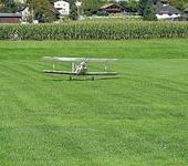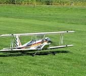 Хотели потаскать планера новой Белланкой 3300мм и мотором 112см3, но во время пробного старта у мотора треснула бобышка крепления винта и срезало посадочную шпонку… Биплан выручил…