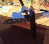 - Основная проблема заключается в том, что пилон стабилизатора крепится снизу балки – стандартный метод центровки стабилизатора с крылом (вклейка с перевернутым крылом) не проходит. Вынужден был придумать одинаковые подставки под крыло, крепить его на этих подставках, чтобы не съехало и долго промерять симметрию.