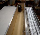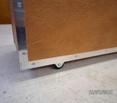 Собран из трёхмиллиметровой фанеры, оклеен искуственной кожей, везде по периметру окантован алюминиевым уголком 15х15 мм.