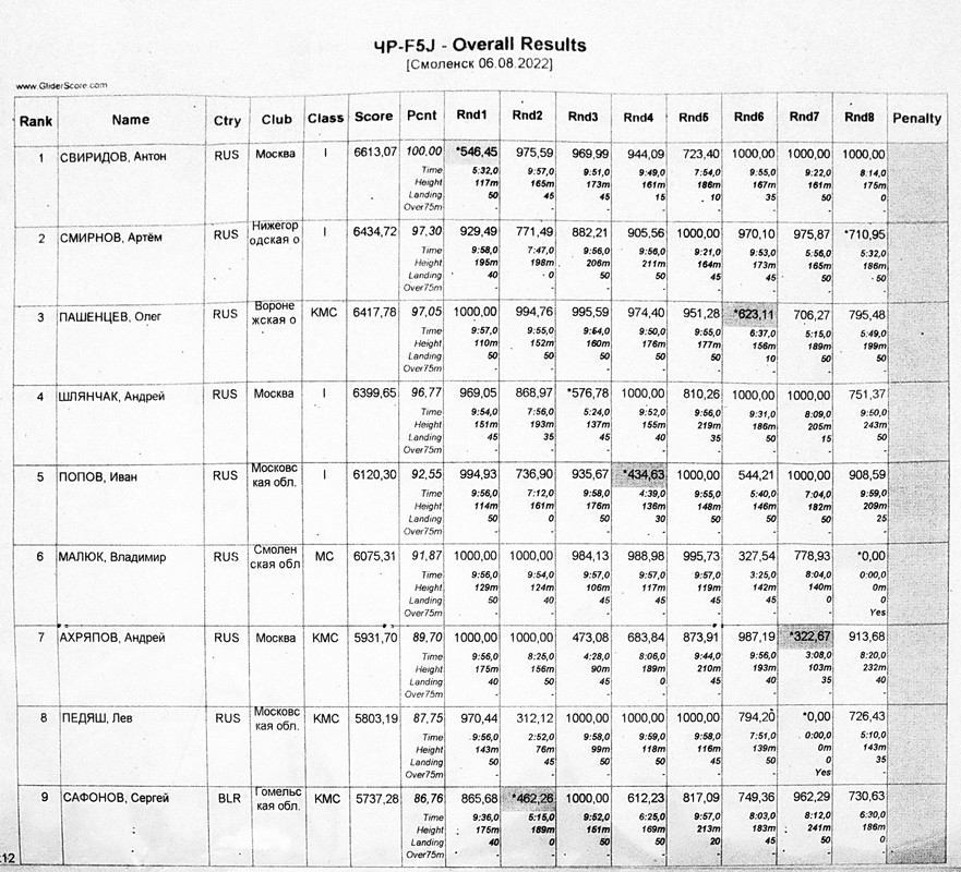 На брифинге в начале было заявлено 8 туров и 3 финала (вместо 10 основных, погода могла подкинуть грозу). Когда попытались ввести все же 9-й и 10-й туры, многие уже разбирали планеры, и потребовалось разбирательство жюри. Оставили 8, и обоснованно - уже “держало” плохо, и так финалы выродились в падение из стратосферы. В последнем финале только Малюк зацепился и налетал 15 мин., вырвав второе место (несмотря на конский штраф за высокий взлет), остальные попадали раньше (см. табл.).