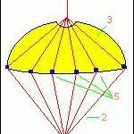 1 - Кольцо к лееру 2 - Стропы 3 - Купол 4 - Кольцо к модели 5 - Места пришивания строп к куполу парашюта Купол парашюта раскраивается из легкой синтетической ткани (например пертекс) в виде круга. В его центре прорезается отверстие под выходящие стропы. Парашютик имел диаметр сантиметров 40. Восемь строп пропускаются сквозь это отверстия. Они соединяются вместе в двух сторон. С одной стороны устанавливается кольцо для соединения с леером, а с другой, для зацепления модели. Стропы подшиваются к краям окружности так, что бы при полностью натянутых стропах и максимально оттянутом куполом в строну модели, стропы с кольцом (крепления к модели) были от вершины купола на некотором расстоянии (например сантиметров 10). Пока леер натянут - стропы натянуты и располагаются вместе. Т.к. к ним пришит купол, то он стянут и не может раскрыться. Как только модель отцепляется, то стропы тянуться в сторону леера и парашют раскрываются.