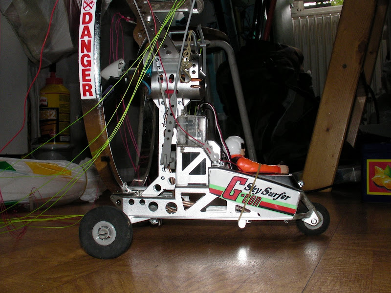При выходе на улицу первой перестала работать рулевая машинка. Она и дама работала как-то коряво, а на улице перешла к единичным подёргиваниям и пожуживаниям. Не смотря на это решили все равно провести лётные испытания. И… Не полетело… Как только не пытались его поднять в воздух и кидая как в их рекламном ролике. И с низу, и с верху, и бегом, и на велосипеде. Не летит. При полной газульке тупо идет в низ и всЁ. Попытки регулировки угла атаки купала также никуда не привели. Очевидная нехватка тяги и никакой жеваный купол не дают никаких шансов на полёт. Складываться ощущение что сиё чудо вообще в стоковом варианте лететь не может. 😦