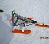 Поэтому его проходимости и маневренности я уделил особое внимание . В принципе с такой конструкцией лыж и развесовкой по опорам , можно двигаться где угодно ,на льду и по пухляку они идут одинаково уверенно у меня не получилось застрять на них в сугробах ,исключение составляют места с высокой травой и кустами , глубокие следы в снегу . Проблему для пластика может создать мокрый снег ,скотч приклеенный к лыже не помогает а наоборот становится хуже ,лыжа нагребает санки зарываются . Проблему можно решить купив пасту или воск для лыж . общая площадь опоры 7 дм2 ,масса около четырехсот граммов .Лыжи изготовлены по классической схеме ,то есть центр давления располагается на шестидесяти процентах длинны от носика что бы создавался так называемый эффект глиссирования по рыхлому снегу.