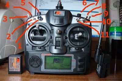 Переключатели 10, 2, 3 - переключатели кривых регулирования соответственно для элеронов, рулей высоты и направления. Эти переключатели не использую, т.к. я начинающий и мне пока хватает по одной настроенной кривой для каждого руля.
