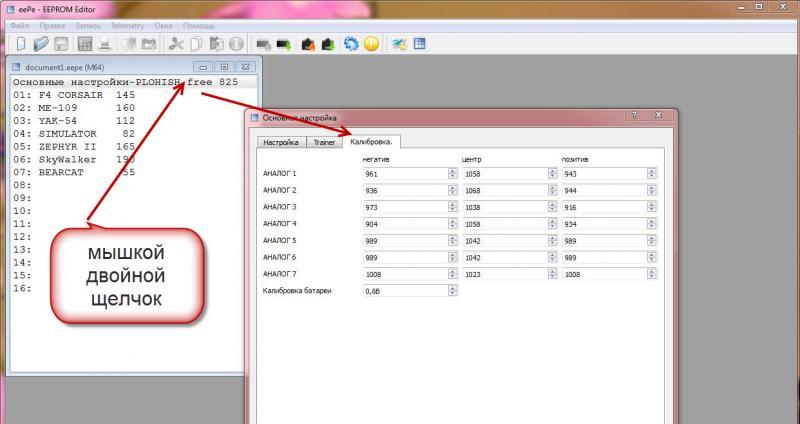 Давай. Но боюсь, что нет там таких цифорок. Во всяком случае, я их не нашёл. Там есть тримы и субтримы. Их можно посмотреть не только в еепе, но и на самой аппе в настройках модели. Фокус в том, что калибровка и тримы-субтримы, это разные вещи. То есть, уползание калибровки никак не отражается ни на тримах ни на субтримах, и то и другое остаётся в нулях. Но ползунок на мониторе аппы при этом смещается от центра и смещение передаётся в радиомодуль и потом на модель. Если оттриммировать это смещение, то сигнал встаёт на ноль (фактический), но появляется смещение в виде цифр на субтриме.