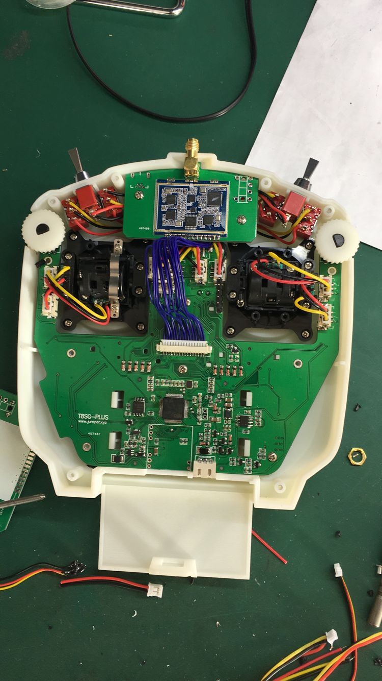 После получения “Jumper T8SG V2 Plus” рекомендую разобрать передатчик и скрутить в жгуты провода от стиков. Исходно провода не скручены и имеются существенные РЧ помехи на входах АЦП микропроцессора, зависящие от используемого протокола и выходной мощности РЧ модуля.