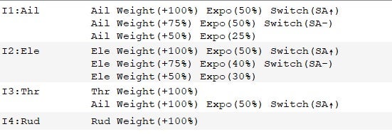Выше пример двойных, нет даже тройных расходов по каналам элеронов и руля высоты. Причём со своей экспонентой. В канале газа меняется только экспонента. Переключение тумблером SA.