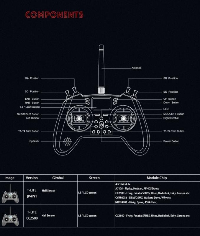 Внутренний многопротокольный модуль 4 в 1 или модуль CC2500(соответственно набор протоколов разный), съемная антенна, OpenTX.