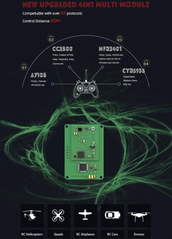 Версии: Однопротокольный модуль: CC2500, Мутипротокольный модуль: JP4IN1