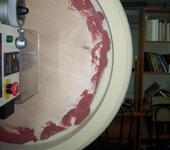 зашпатлеванный болван, который вращается на станке, опускаю на шаблон с наклеенной наждачкой. В моем предыдущем посте на первой фотке виден шаблон. Процесс очень долгий. Зато поверхность должна получиться прочной. 1-ый слой шпатлевки со стекловолокном около 3мм, 2-ой - около 2мм. Все делается впервые, поэтому не знаю, какая должна быть прочность болвана. Может надо меньше шпатлевки класть или оклеивать стеклом, а потом наносить небольшой слой шпатлевки и шкурить под размер…
