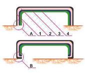 На схеме “A” и “B” - варианты исполнения краёв “скорлупки”, 1 - матрица, 2 - верхний (прозрачный, глянцевый) слой, 3 - углеткань с пропиткой, 4 - дополнительный армирующий слой; оранжевым цветом обозначена плоскость, к которой прилегает накладка.