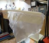 Далее, берем стеклоткань 30 гр/м2, укладываем с нужной ориентацией и проводим кисточкой фиксирующую линию вдоль всего размаха. Просушиваем клей феном. Клей усыхает до невидимого прозрачного состояния, стеклоткань относительно крыла фиксируется. Затем, натягивающими движениями кисточки проклеиваем ткань от фиксирующей линии к кромкам.