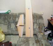 Вес одной консоли 180 грамм, при этом две сервы в крыле и стыковочный пенал, скрученный на бумаге с тем же ПВА Д3. Кстати… пенал делается весьма просто. Сначала бумага набухает, затем усаживается при высыхании на алюминиевом стержне, затем спокойно снимается и далее насаживается плотно в притирочку, без люфтов. Использую квадратный алюминиевый профиль 10х10х1.5мм из строительного магазина, в качестве штыря или болвана для формовки пеналов. Пенал вклеен между полками лонжерона, на тот же самый Д3 и полки по всему размаху вклеены на Д3(не разбавленный). Вообще, во всем самолете применено 2 клея, Д3 и титан. Титан в узких узлах, где дерево к текстолиту надо клеить, в остальном везде Д3. Кабанчики в прорезь вклеены на Д3 и закрыты стеклом.