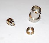 у меня уже пришла новая голова. так что вопрос уже по любому решен, но… делал вчера разьем для антенны лпд рации, и обратил внимание на переходник BNC-SMA, у него SMA часть которая на разьем рации наворачивается имеет внутр резьбу свечи! (1ое фото), недолго думая, беру плашку на М8 и сточив надфилем грани, прогнал поверх М8, получилось обалденная втулка из латуни.вот токо неудачно довернул в конце плашку и обломил втулку не так как хотелось бы… Побежал в радиомаг за новой, гляжу, а там вобще готовая втулка продается 😃. Этакий разьемчик, см на втором фото. Осталось только отпилить да обточить. На радостях, грубо ошибся со сверлом, зол был на себя очень сильно, вместо 7ки сверло взял на 7.7мм и расверлил им голову. 😦. Метчик на М8 только только сделал резьбу. Втулка вкручивалась весьма легко, хотя в некоторых местах получался натяг. Купил в автомаге герметик для восстановления прокладок на ДВС DoneDeal, Т от -70 до +345С. Обмазал, выдержал 15 минут как написано и вкрутил, ну вроде в конце с небольшим натягом пошла, так и оставил. Сегодня вечером испытания, думаю врядли вылетит, сколько то но резьба есть и держит, а там может закоксуется маслом да крепче будет. Поглядим, на балконе долго крутить не получиться, если заведется и поработает чуть на макс оборотах. то на днях как будет погода испытаю в полете. Еслиб не ошибка со сверлом, 100% рабочий вариант!
