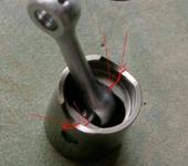 - Треснутый поршень!! Поршень сделан из алюминивого сплава и покрыт толи хромом толи никелем. Палец фиксируется кернением проушины под палец в виде крест накрест. Так вот в результа этой операции обе проушины имеют трешины по юбке поршня. В местах трешин видна деформация - кернение наносилось прям по поршню!!! без использования фасонных вставок - это вредительнство и саботаж. За такое растреливать нада. Уроды.
