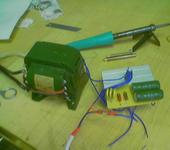 Трансформатор ТН61-220-50, три катушки которого были спаяны паралельно (внимание, тут надо соблюсти полярность, хоть напряжение и переменное). Ток 40 ампер при 6 вольтах.