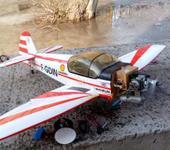Сегодня не выдержжал и вытащил Спитфайер на пробу в полетном состоянии. Мотор категорически отказался заводиться вниз головой. Пришлось тащить подставку и первый старт делать вверх головой. Мотор завелся без проблем и все остальные запуски заводился уже вниз головой. Обычно со второго рывка. Холостые пока толком не выставлял, но блин самолет содрогается всем корпусом когда мотор тарахтит на малых оборотах. Это раз. 15-ый винт с поднятым хвостом вращается в очень стремной близости от планеты. Учитывая мою ВПП, одно неловкое движение стиком и лопасти поотлетают. Это два. Режим полного газа выставить не получилось. Малый, средний газ без проблем, даешь полный и мотор взвыв через 2 сек. глохнет. По мере забеднения смеси время работы увеличилось до 7 секнд, обороты померять не успел, но по звуку не выше 9000-9400. Дальнейшие настройки отложены на потом по причине поднявшегося ветра. Порывы такие что самолет, привязанный за хвост, подпрыгивает на месте. Решил не рисковать моделью.