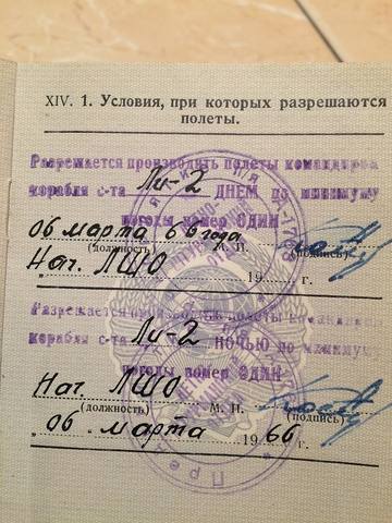 ПС: Интересная отметка в свидетельстве - “Разрешается производить полеты командиром корабля с-та Ли-2…” Из-за слова “корабля” много народа помучалось при оформлении пенсии по 155-ФЗ в конце 90-х…
