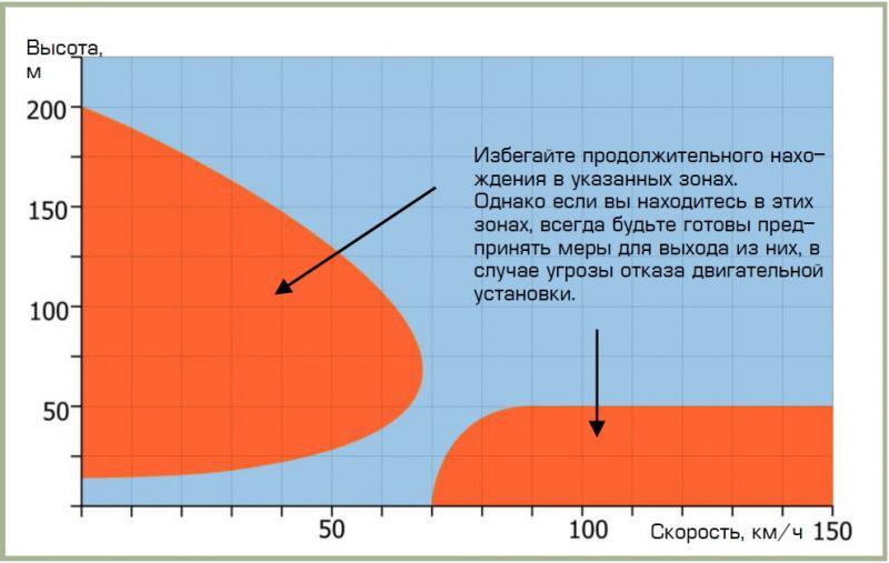 Это из РЛЭ реального вертолета в маштабе 1:1. В нижеприведенной диаграмме в масштабе скорость – высота показаны опасные зоны, в которых не рекомендуется пилотировать вертолет, так как при отказах дви-гателей безопасная посадка на авторотации не гарантируется.