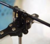 См. мою фотку специально снял флайбар и тяги от него к ротору. в просветах между осью и двумя чёрными квадратами видны стержни на которых крепится ротор. На этих стержнях всё это хозяйство может поворачиваться вверх/вниз где-то градусов на 45(пока не упрётся в ось), но никак не двигаться влево/вправо или крутиться вокруг оси - крутиться должно вместе с осью!