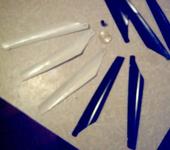 Итак: берём ПВХ уголок, трубу и строительный фен (термопистолет). Располовиниваем его на 2 пластины. Размечаем на уголке лопасть по контуру родной (лучше карандашом - ручка мажется и стирается). Вырезаем лопасть по контуру с припуском 1-1,5 мм с одной из длинных сторон. Кладём заготовку на трубу, включаем фен и греем. Греть недолго (секунды) и фен регулировать не больше, чем на полмощности. Заготовка начинает немного коробиться и тогда руками в перчатках обжимаем её по трубе. Сразу как правило плный контур не получается, поэтому греть приходиться 3-5 раз, корректируя форму. Снимаем готовую лопасть с трубы, размечаем и сверлим отверстие крепления - 2 мм. Ставим лопасти на вертолёт и полетели.