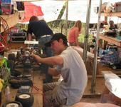 клеит (ПВА), сверлит, режет, паяет, заклепку латунную освоил (с дедом).