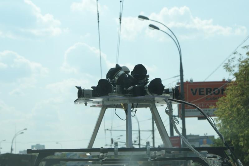 Стоят камеры и GPS. Все подключено к спидометру. Машины едут со скоростью 30 км/ч и камеры фоткают каждые 20 метров. В итоге получается большая панорамная фотка.