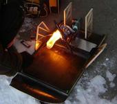 Возвращаемся на хату, греть оборудование. По прошествию 10-15 минут быстро выбегаем, раскладываемся на подъездном крыльце, пытаемся завести… И снова облом! Эта железяка даже топливо сосет медленнее, чем остывает! 😦 Впрочем, довольно заметное влияние оказывало то, что накануне двигатель был промыт бензинчиком, а карбюратор промыт не был вовсе 😃 И, как это часто бывает, пока все это не просолилось свежим топливом, было потенциально мертво. Нагрев двигателя факелом с бензином тоже не помог. Точнее, мог бы помочь – но уж очень неудачно стоить двигатель – снизу фанера и пластиковая качалка заслонки карбюратора, ни к картеру, ни к горшку огнем не подлезть…