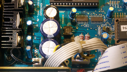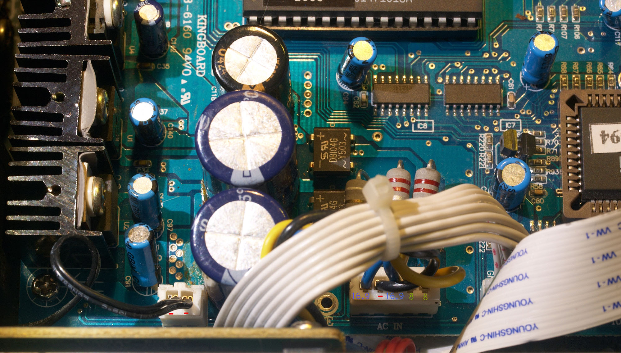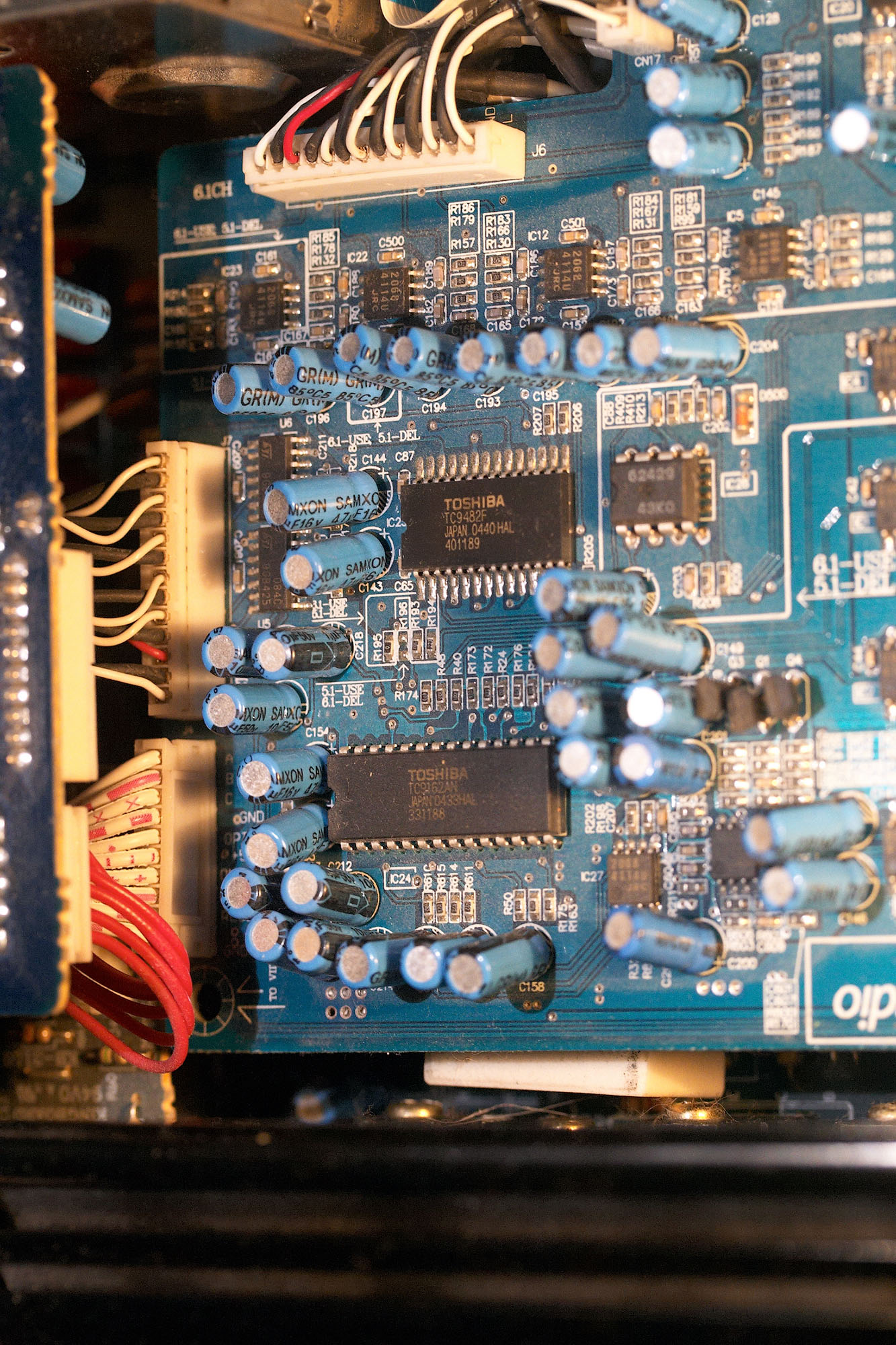 Итак, на входе платы декодера (этот вход не видно на фотках, он у самой задней стенки) там с сигналом все хорошо, звук чистый и громкий. В режиме Direct in на выходе декодера (а это как раз тот разъем, что виден на первой фотографии внизу слева) есть очень тихий прерывистый звук (!), частота прерывания примерно 2 Гц. Если подключить источник звука цифрой по коаксиалу (SPDIF) или по оптике, то звука нет совсем.