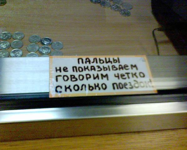 мне вот стало интересно - почему кассиры метро, не любят когда им показывают пальцами сколько нужно поездок?) Если кассирша не слышит, соот машинально поднимаешь руку и указываешь пальцами на сколько тебе поездок нужна карта. Сам был жертвой кассирш, когда не услышав мой голос и указав пальцами, что мол надо 2 поездки получил ушат помоев